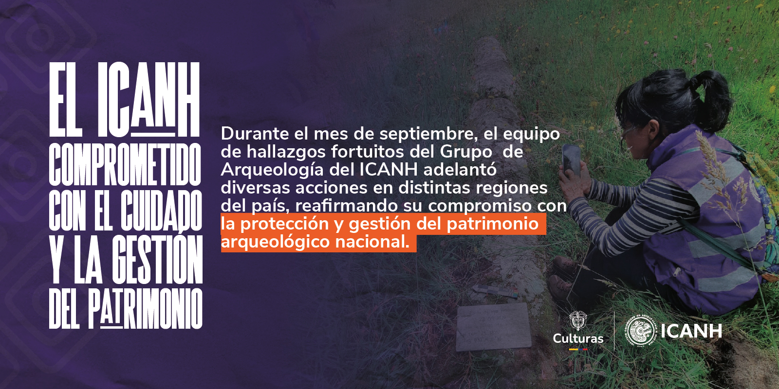 Te puede interesar EL ICANH COMPROMETIDO CON EL CUIDADO Y LA GESTIÓN DEL PATRIMONIO Durante el mes de septiembre, el equipo de hallazgos fortuitos del Grupo de Arqueología del ICANH adelantó diversas acciones en distintas regiones del país, reafirmando su compromiso con la protección y gestión del patrimonio arqueológico nacional. El Doncello, CaquetáEl ICANH, previa coordinación con la alcaldía municipal, visitó la inspección de Berlín para verificar bienes arqueológicos que se encontraban en custodia de la comunidad local. El equipo