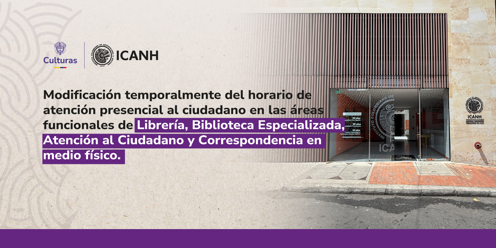Modificación temporal del horario de atención presencial al ciudadano en las áreas funcionales de Librería, Biblioteca Especializada, Atención al Ciudadano y Correspondencia en medio físico El Instituto Colombiano de Antropología e Historia ICANH, informa a la ciudadanía en general, que mañana 1 de abril se cambiará temporalmente el horario de atención presencial al ciudadano en el área funcional de Biblioteca Especializada, la Oficina de Correspondencia y la Librería de la entidad. Agradecemos su comprensión y volveremos el próximo lunes 6