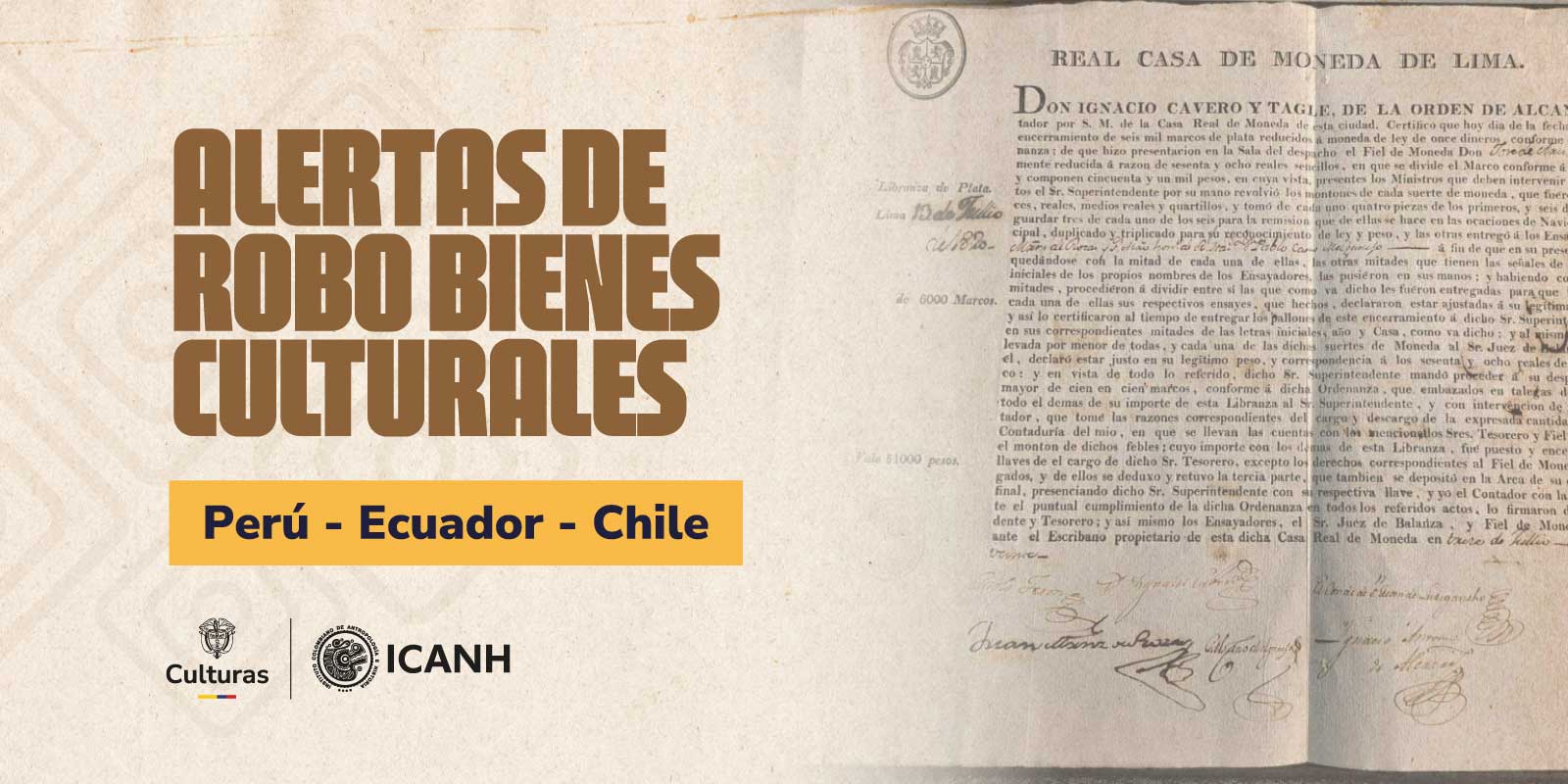 El Instituto Colombiano de Antropología e Historia ICANH, informa a la ciudadanía en general sobre la sustracción de bienes culturales en los países de Perú, Ecuador y Chile. A continuación relacionamos las piezas mencionadas: Difusión de 2 alertas virtuales (606,607) sobre bienes sustraídos en Perú El 14 de noviembre de 2025, la Dirección General de Defensa del Patrimonio Cultural del Ministerio de Cultura de Perú, informa acerca de la sustracción de bienes pertenecientes a su patrimonio cultural. Las alertas recibidas