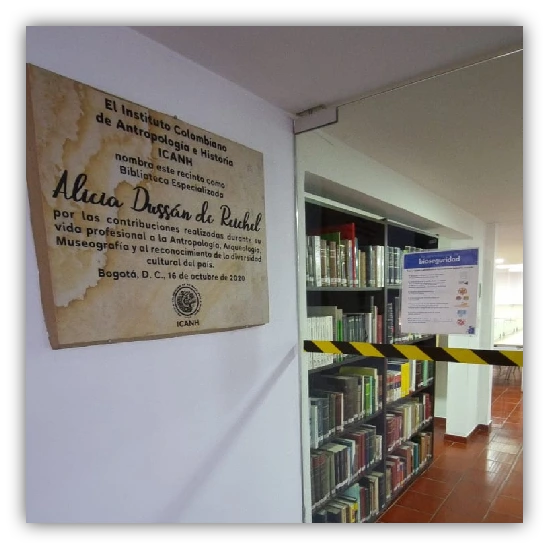 El Instituto Colombiano de Antropología e Historia (ICANH), tiene al servicio de los ciudadanos la Biblioteca Especializada Alicia Dussán de Reichel, ubicada en la ciudad de Bogotá en el Centro Histórico, en el barrio La Candelaria, en la calle 12 N° 2 – 38 segundo piso.